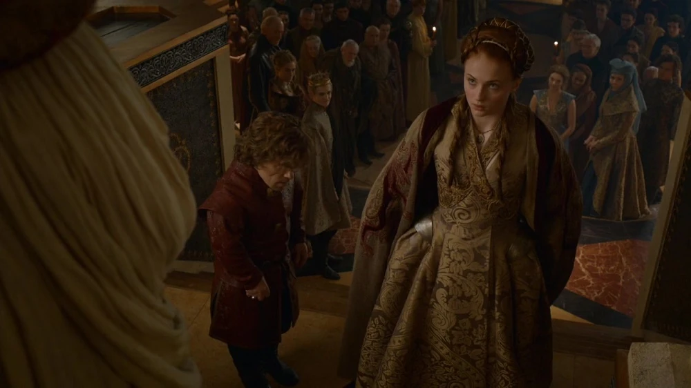 Tyrion Lennister ummantelt Sansa Stark bei der Trauung in der Großen Septe von Baelor.