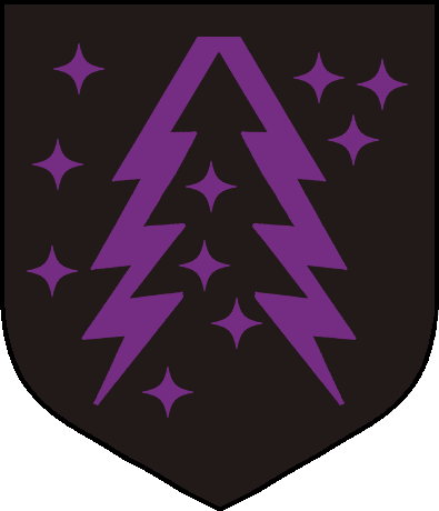 Das Wappen des Hauses zeigt einen gegabelten Blitz und vierzackige Sterne in Lila auf schwarzem Grund.[1]