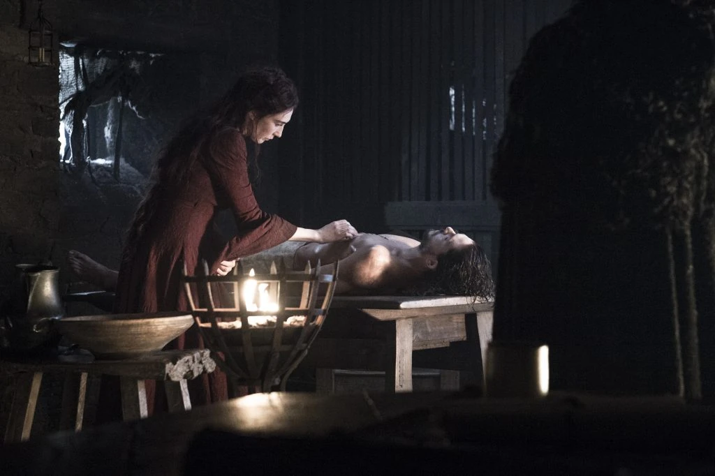 Melisandre ist in ihrem Glauben an den Herrn des Lichts desillusioniert und enttäuscht, dass sich ihre Voraussagen anscheinend nicht erfüllt haben. Traurig sitzt sie am Kamin, als Davos sie aufsucht und bittet, den toten Jon wieder ins Leben zu rufen. Sie traut sich das zwar nicht zu, ist aber bereit, es zu versuchen, als Davos sie an ihre gelungenen Wunder erinnert. Gemeinsam mit den verbliebenen engsten Vertrauten umringen sie den Leichnam, den Melisandre sorgfältig reinigt. Sie vollzieht ein Ritual indem sie abgeschnittenes Haar ins Feuer wirft und dabei wiederholt etwas in valyrischer Sprache murmelt. Sie legt ihre Hände auf den Leichnam, in der Hoffnung ein Lebenszeichen zu spüren, das aber ausbleibt. Resigniert stellt sie das Murmeln der Beschwörungsformel ein. Tormund verläßt den Raum zuerst, dann die anderen, zuletzt Davos. Einzig der schlafende Schattenwolf Geist bleibt mit dem Leichnam zurück, der plötzlich etwas wittert und den Kopf hebt. Ebenso plötzlich löst sich ein tiefer Atemzug aus Jons Körper, dem weitere folgen.[23]