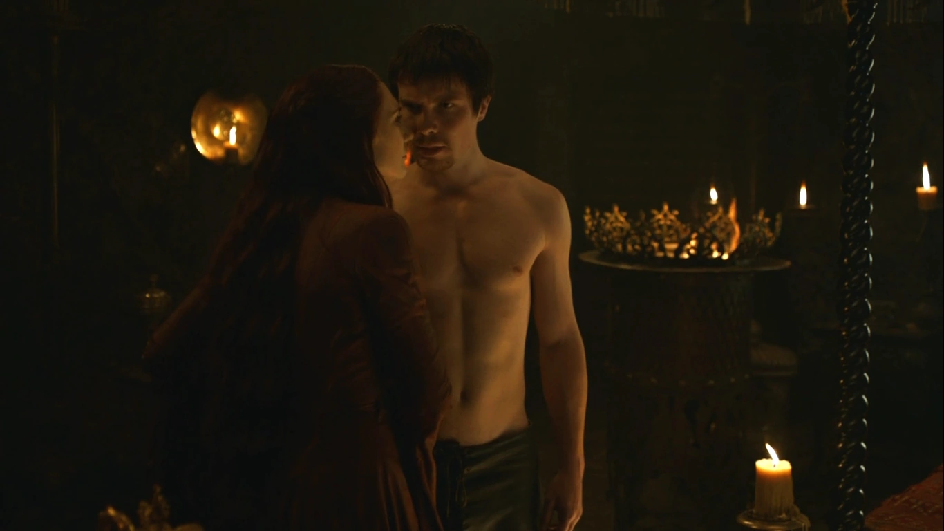 Aufgrund seines Ehegelübdes lehnt Stannis ihre Annäherung ab. Doch Melisandre erinnert ihn schmerzlich daran, dass seine Frau schwächlich und krank ist. Selyse ist in einem Turm eingesperrt und ekelt Stannis an. Sie hat ihm keine lebenden Sohn geboren, nur Totgeburten. Sie kann ihm einen Sohn schenken. Sie wiederholt das Versprechen und küsst ihn dabei. Stannis gibt seinem Verlangen nach und beide schlafen miteinander.[2]
