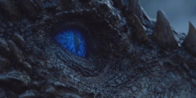 Auf Befehl des Nachtkönigs wird der Leichnam von Viserion durch Wiedergänger an Ketten aus dem Wasser gezogen. Der Nachtkönig berührt mit der Hand Viserions Kopf und seine Augen öffnen sich. Sie sind jetzt vom eisigen Blau eines Wiedergängers.[20]