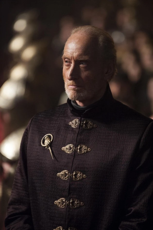 - Военные доспехи Тайвина, как и его сыновей и гвардейцев, черно-красные, а не красно-золотые, как в книге; вместо золотого в бою он носит красный плащ, перекинутый через плечо и перехваченный ремнем на поясе.