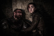 Arya, Hot Pie, and Gendry continue traveling to Riverrun. They are eventually captured by the Brotherhood Without Banners, who mistake them for war refugees. They are taken to a local inn where they are fed. Just as they are about to leave, Sandor Clegane is brought in as a captive. Despite trying to stay out of his sight, Clegane spots Arya and reveals her true identity.[21]