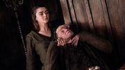Brienne wins after beating Sandor with a rock and knocking him down a small cliff. Arya, rather than going with Brienne and Pod, hides from them until they leave. She then goes down the cliff to find the gravely injured Sandor, who begs her to kill him. When Sandor believes she won't do it, he tries to goad her into doing it, telling her that it is another name to strike off her list, he killed the butcher's boy when he begged him for mercy, and he should have raped Sansa when he had the chance. Instead, Arya takes his money and leaves him to die.[34]