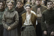 Arya is afraid of being recognized when Petyr Baelish visits Lord Tywin, but he says nothing. Tywin catches her reading a letter detailing his troop movements and questions where she learned to read. She distracts him by asking about his own childhood and steals the letter. She is caught carrying it by Ser Amory. She manages to escape him and names him as her next victim to Jaqen. Jaqen kills him before he is able to expose the theft.[17] Tywin believes that he was the intended victim and begins a brutal investigation, ordering the deaths of dozens of his own men. He tasks Ser Gregor with rooting out the Brotherhood Without Banners, believing that they are responsible for the assassination. Tywin talks to Arya about the importance of legacy and the destruction of Harrenhal in the War of Conquest. His suspicions are heightened by her own knowledge of history.[18]