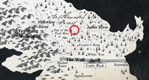 Loosely approximate location of the cave of the Three-Eyed Raven: due north from Craster's Keep, and roughly east from the Fist of the First Men.