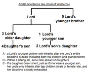 Andal inheritance law (followed in most of Westeros): male-preference primogeniture
