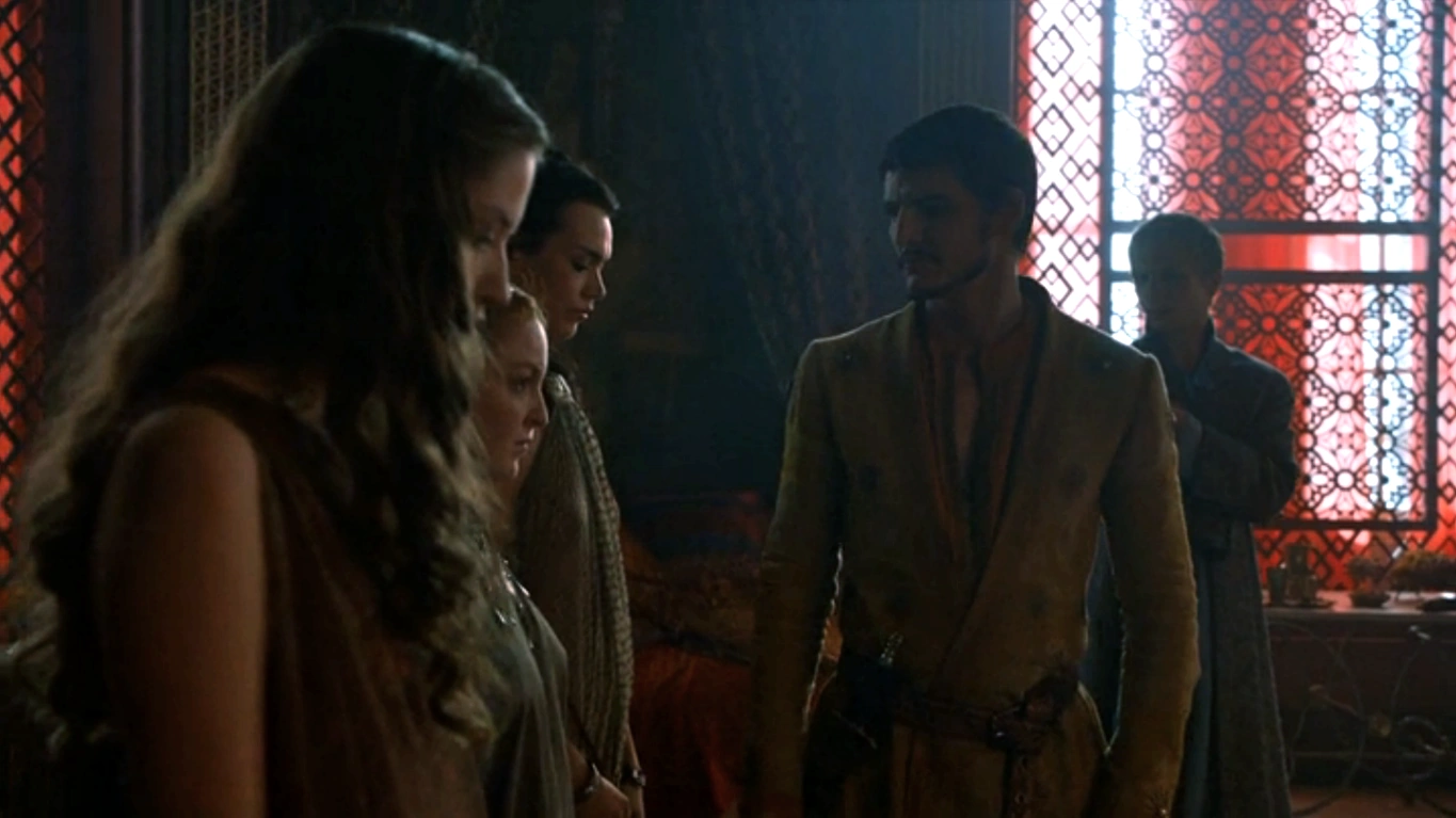 The embassy of Dornish nobles arrives at King's Landing in the Season 4 premiere; in the novels, several of them were women rulers of Dornish vassal Houses.