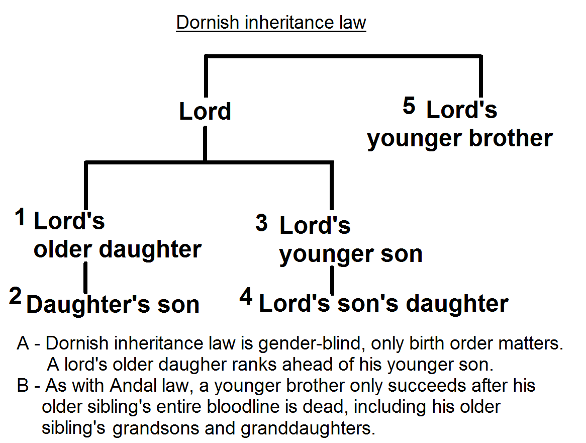 Dornish inheritance law in the novels: gender-blind primogeniture.