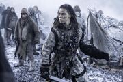 The "Free Folk" (wildlings) that live beyond the Wall actually have a strong tradition of having women warriors, and several of their clans in the novels are headed by women. The vanguard of Mance Rayder's army is even commanded by the cruel Harma Dogshead, so-called because as a war-banner she uses a totem with a dog's head impaled on it (killing a new dog every fortnight to supply a new head). Harma is killed in the Battle of Castle Black by Stannis's forces. Another wildling chieftainess is Morna White Mask, so-called because she wears a mask made of white weirwood and never takes it off. After Mance's defeat, Morna is one of the wildling leaders that swears fealty and good behavior to Jon Snow in exchange for her and her followers to be allowed to pass to the south side of the Wall. In the novels, Mance Rayder has a wife named Dalla who dies in childbirth during the Battle of Castle Black itself, though she is survived by her sister Val. Following Mance's defeat and execution, his sister-in-law Val becomes a sort of informal leader/spokesperson for many of the wildlings who followed him. Men in the Seven Kingdoms, from both Stannis's army and the Boltons, are impressed with Val's capability and call her the "wildling princess" - though Val herself points out she has no formal position, she's just Mance's sister-in-law.