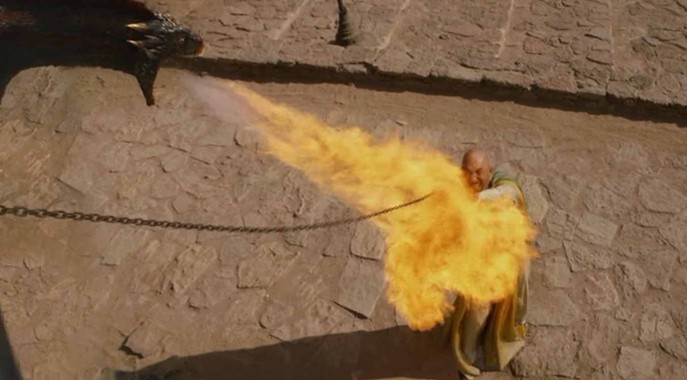 Daenerys and her dragons use fire to kill and escape Pyat.