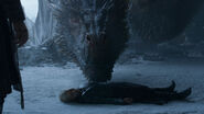 After the battle, Drogon returns to where he left Daenerys. Wounded and exhausted, he comforts his mother as she mourns the death of Ser Jorah.[33]