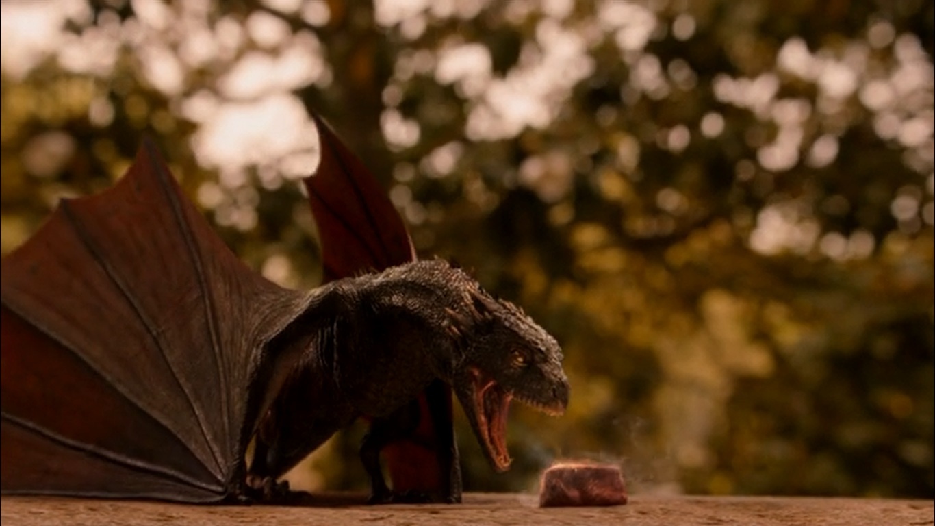 Drogon and his brothers are now the size of small horses. He quietly rests his head on his mother's lap as she caresses him. When his two brothers come back with a dead lamb, he joins the fight over the carcass. His mother tries to calm him down, and without warning, Drogon snaps at her with a hiss; a warning to not interfere. He then roars and goes to contest the kill. Daenerys is shaken, fearing that she is losing influence over her "children", as dragons can never be truly tamed.[15]