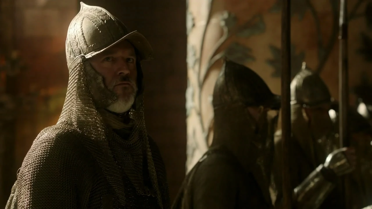 Arya sees Slynt at the Sept of Baelor throw her father down on his knees for Ser Ilyn Payne to behead him and later triumphantly holds Ned's head up for all to see. Tywin is indignant that he was raised to Lord of Harrenhal, due to his low birth and Harrenhal having been the seat of a King. He vows that Slynt will never take up his seat if he has any part in it. Slynt's elevation is one of the many questionable decisions by Cersei and Joffrey that prompts Tywin to send Tyrion to King's Landing to be acting Hand, and rein them in. When confronted about Slynt's appointment, Cersei admits to Tyrion that Slynt is not as competent as could be wished (as he was stupid enough to believe he could arrest as skilled a knight as Barristan Selmy with only two men, not thinking that Selmy might choose to fight rather than come quietly).