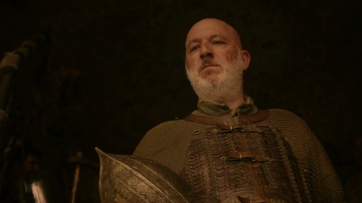 Janos Slynt has arrived at Castle Black along with Ser Alliser Thorne, who has taken temporary command of the castle. He joins Ser Alliser, Maester Aemon and two other black brothers to listen to Jon Snow's testimonies (it is unexplained how Slynt was immediately high-ranking enough to join the panel). Slynt is dismissive of Jon's claims, referring to Jon as "the bastard son of a traitor" and argues for his execution. When Jon asks him if he has ever been North of the Wall, he boasts that he commanded the City Watch of King's Landing and grows angered when Jon sarcastically retorts he must have been bad at his job to have been sent to the Wall. Slynt clearly does not believe Jon's report as he laughs at his claims of giants in the Free Folk's army, but is somewhat mollified when he realizes that the other black brothers do.[7]