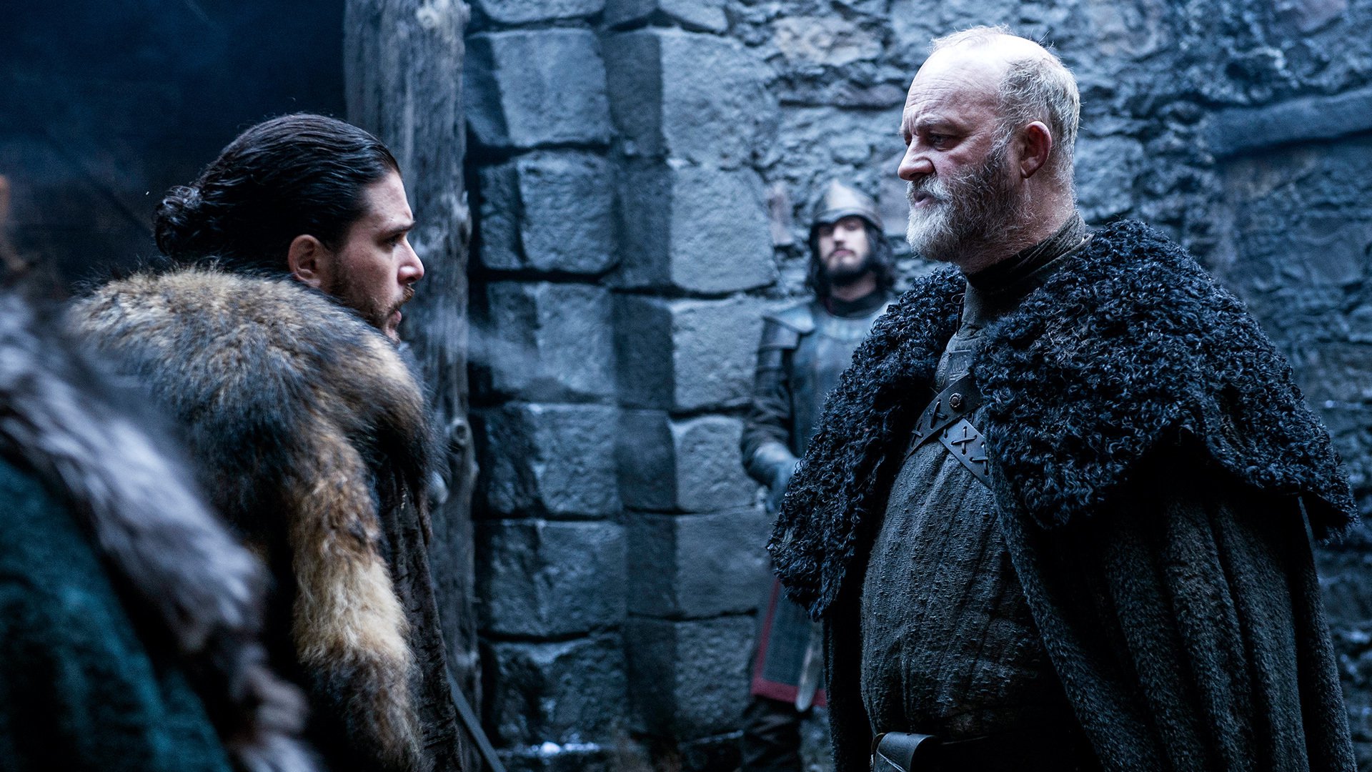 Benjen bids farewell to Jon atop the Wall.