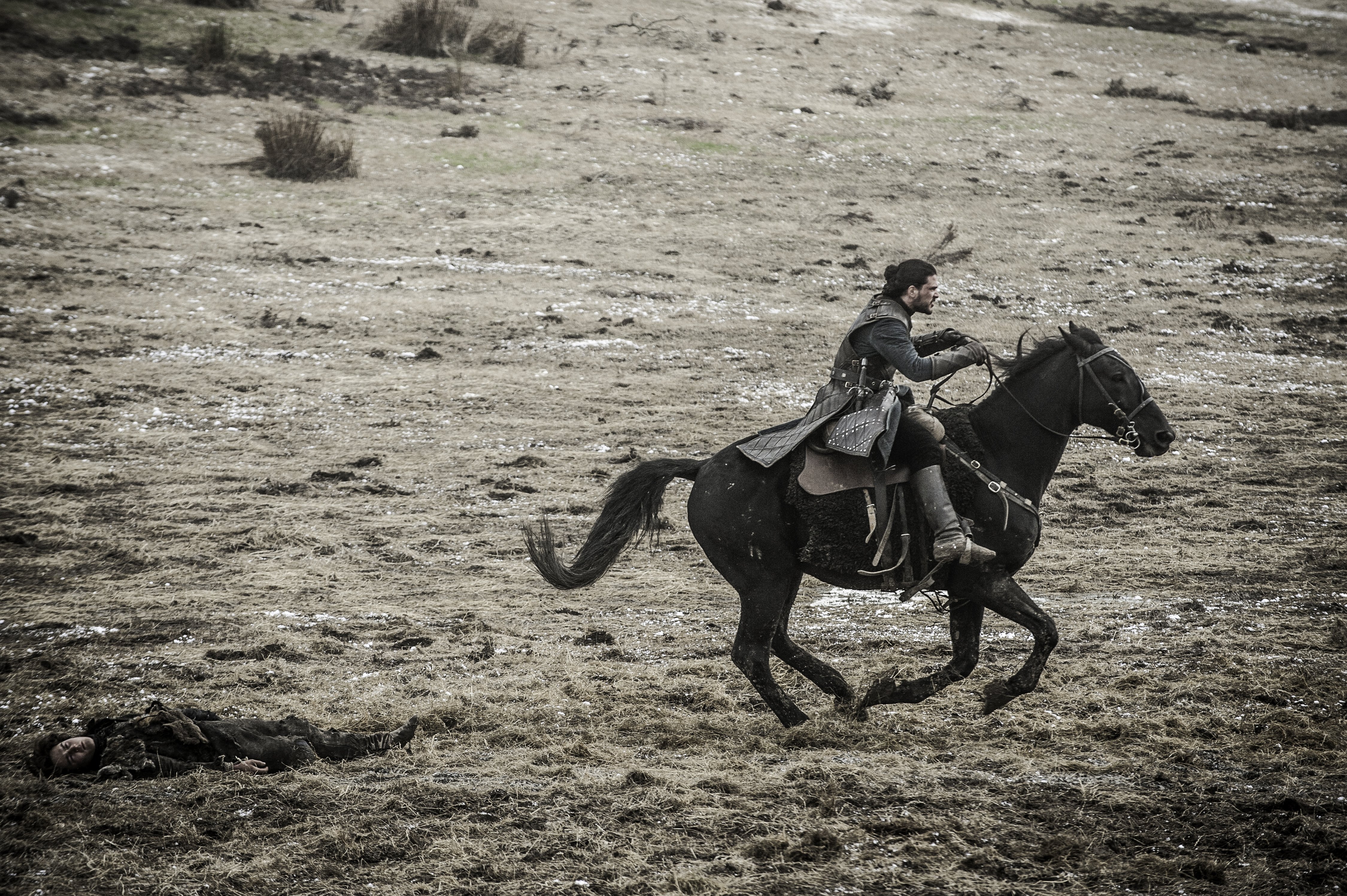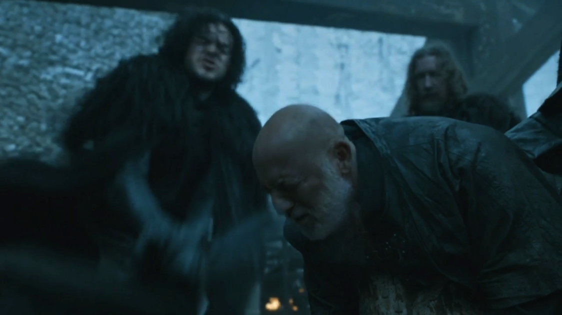 Jon and the wildling party prepare to raid an elderly horse breeder's home for his horses and gold; Jon insists that the old man is no threat to them, but Orell and Tormund Giantsbane intend to kill the man so as to stop him from alerting the Night's Watch to their presence. However, when the party attacks the farmstead, Jon surreptitiously hits a rock with his sword, alerting the old man who flees; Jon also distracts Ygritte when she tries to shoot the fleeing man with an arrow. Outside, Tormund moves to kill the old man, but Orell tells him to have Jon do it instead to prove his loyalty. Jon is ultimately unable to kill the innocent man, and instead, Ygritte kills the man with an arrow.[31]