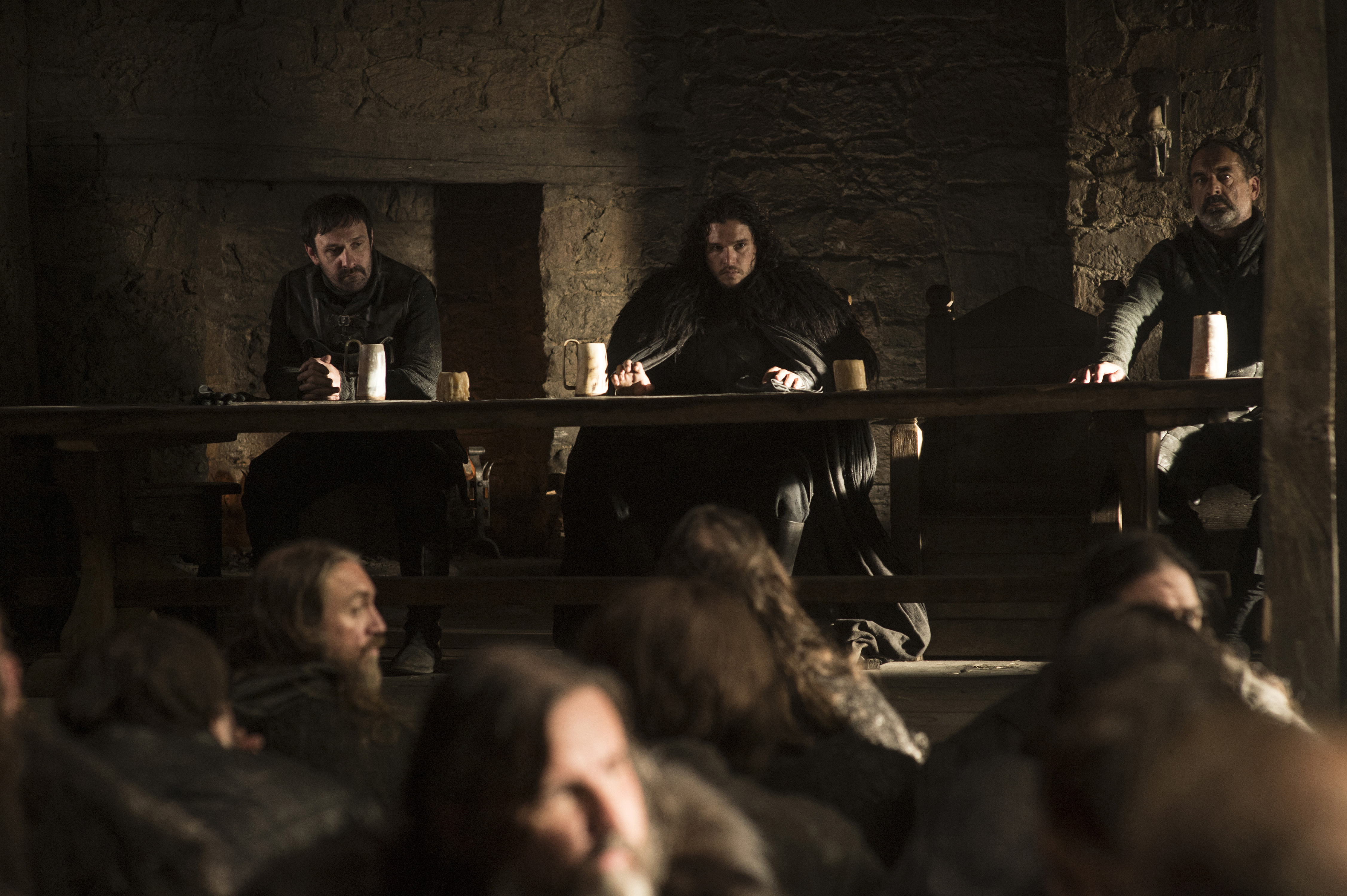 It turns out that Sam had been sent to retrieve Jon, who has been summoned to testify before a panel of five sworn brothers, including Maester Aemon, acting Lord Commander Alliser Thorne, and Janos Slynt (who was exiled to the Wall by Tyrion). At the hearing, Jon admits to killing Qhorin, living amongst the wildlings, and sleeping with one. He also states that Mance intends to attack and gives intel on his plans and strength. Both Slynt and Thorne are openly hostile to Jon, disbelieving much of what he says and call for his execution. Aemon, however, realizes that Jon is speaking the truth, and the hearing ends with Jon being allowed to keep his head.[33]