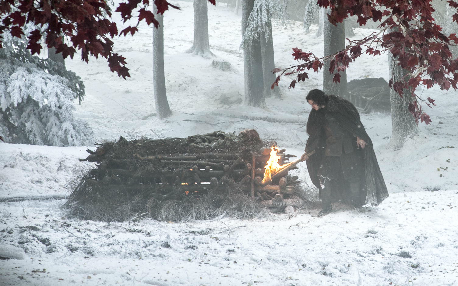 Jon takes his vows before the heart tree beyond the Wall.