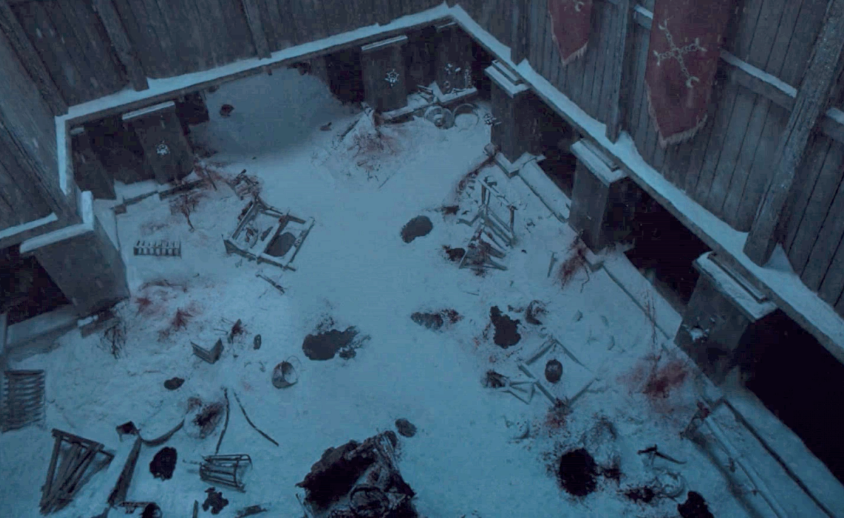 Last Hearth, as the northernmost castle, falls to the Night King, the White Walkers, and the army of the dead after they breach the Wall. In the aftermath of the slaughter, Tormund, Beric Dondarrion, and Eddison Tollett search Last Hearth, only to find it abandoned and ravaged. Inside, they find the corpse of Ned Umber impaled to a wall, surrounded by limbs forming the mysterious spiral symbol used by the White Walkers. Ned eventually wakes up as a wight and is quickly burned by Beric with his flaming sword.[6]