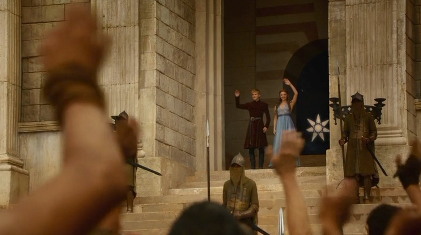 Joffrey and Margaery wave at the pleased crowd.