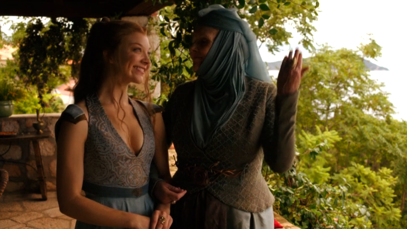 Later, Margaery and OLenna invite Sansa for a private meeting with them at the gardens of King's Landing. Loras escorts Sansa to the gardens for the meeting. During the meeting, Lady Olenna dismisses Mace as a fool for supporting Renly's claim to the throne. By contrast, Margaery speaks well of her late husband.[13]