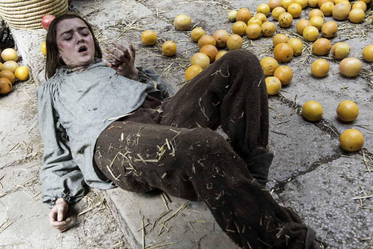 - Maisie Williams revealed in a post-episode interview that the chase was originally going to be even more elaborate, with acrobatic dives and rolls which she suspected were added to make it more "cinematic". Williams was baffled at how Arya could possibly perform such elaborate moves while still recovering from multiple stab wounds so she argued with the stunt coordinators and director to ultimately tone down the moves from what they originally intended, adding in a few more moments of Arya staggering to show that she's exerting herself and in terrible pain, etc.[2]