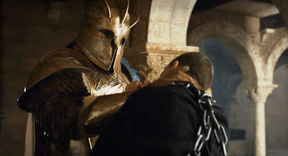 Qyburn informs Cersei that the Faith Militant have been permitted entry to the Red Keep and they demand to see Cersei. Among the Faith Militant is Lancel, who tells Cersei that the High Sparrow would like to speak to her in the Sept of Baelor. However, Cersei refuses, even when Lancel warns her that it was a command and not a request. Cersei retorts that the High Sparrow promised that she could stay in the Red Keep until her trial, to which Lancel replies that no such promise was made. When Ser Gregor Clegane threatens the Faith Militant, Lancel tells Cersei to order him aside or there would be violence. Cersei refuses to let the Kingsguard stand down. One of the Faith Militant proceeds to attack Gregor in the chest, penetrating his armor, but Gregor seems unharmed. In retaliation, the Kingsguard rips off his head, forcing Lancel and his men to stand down.