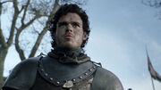There are some minor differences from the books. He tells Bran that when Grey Wind tore off the Greatjon's fingers, he was very scared about the possible consequences but couldn't show it. Later, he accepts his mother's tactical advice while splitting his army in two, appointing the cautious, experienced Roose Bolton in command of the army tasked with delaying the Lannisters at the Green Fork.