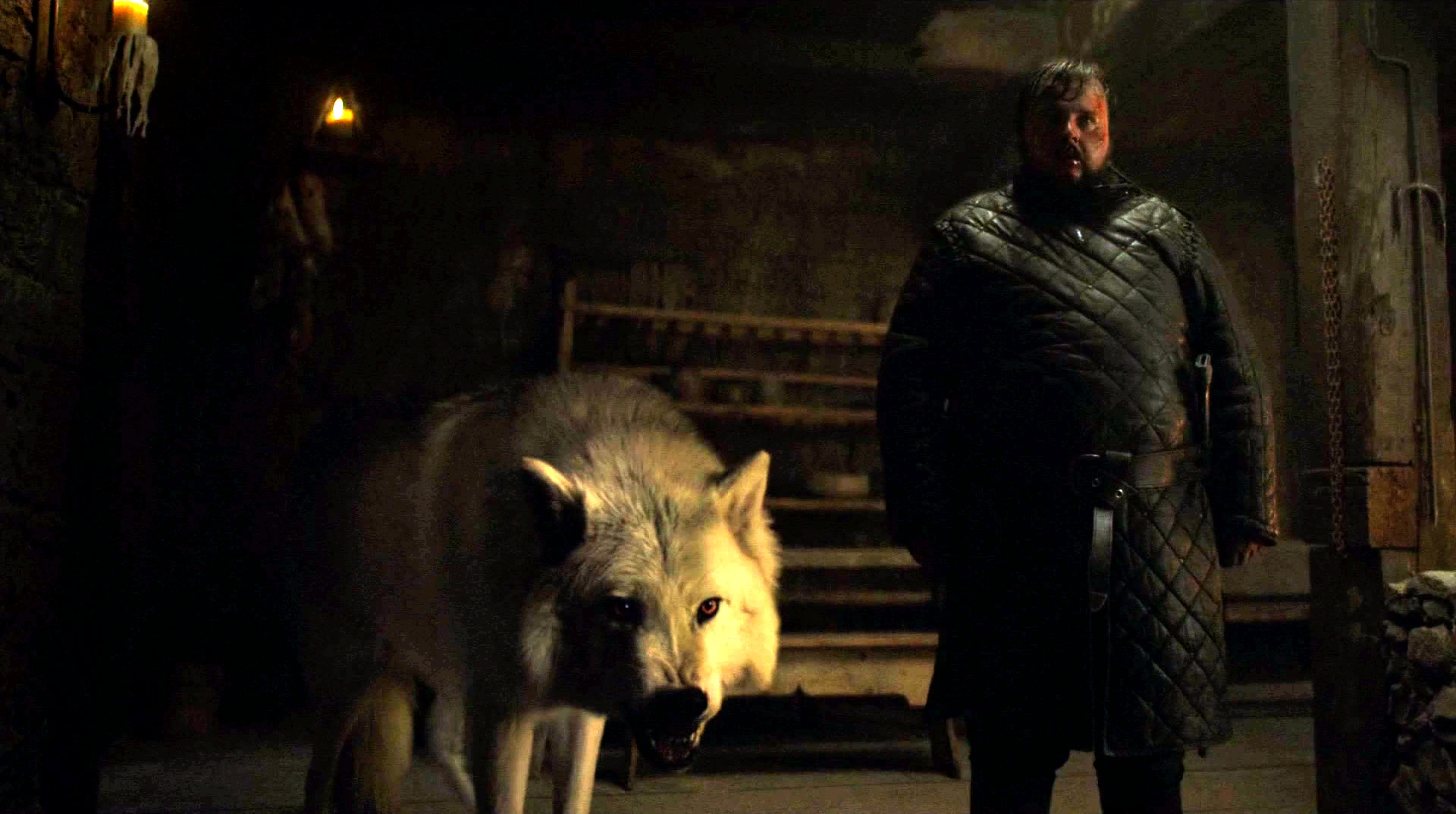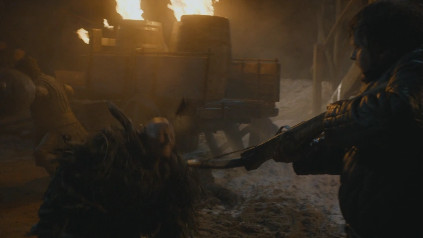 The warg charges at Sam as he desperately attempts to load his crossbow, managing to do so and firing a bolt into the warg's head just before he reaches him. Sam then arrives atop the Wall to ask Jon for more men to defend the castle, and Jon tasks Sam with releasing Ghost from his pen to assist in the fighting. Once the battle was over, Sam returns to Gilly just like he promised and discovers Janos Slynt, who hid in fear during the entire battle.[29]