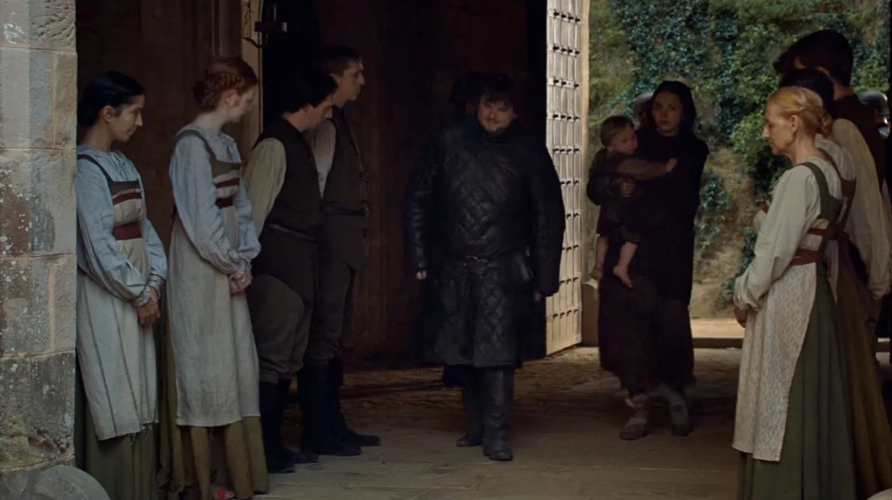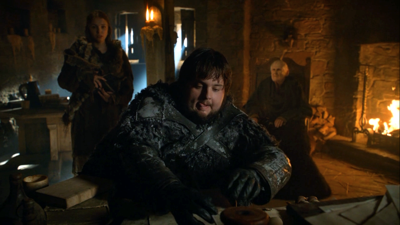 Later that evening, Sam and Gilly joined the other Tarlys for dinner. Sam reveals his plans to train as a maester at the Citadel and promises that he will return to the Wall as soon as he has finished his studies. When Dickon asks him about hunting Beyond the Wall, Sam responds that he hunts rabbits. An openly scornful Randyll then interjects that Jon did all the hunting for him. He also criticizes his son's size (even though Sam is markedly slimmer than he was when he first arrived at Castle Black), and hunting and fighting abilities. Randyll also adds that he will not let his son inherit the family's Valyrian steel sword Heartsbane and House Tarly. Gilly then springs to her lover's defense by pointing out that Sam had killed a Thenn and a White Walker. While Dickon dismisses the White Walkers as a fairy tale, Randyll quickly realizes that Gilly is a wildling. He disparages Sam for allowing himself to be seduced by a "wildling whore." In response, Melessa chides her husband for his "dishonorable" conduct and motions for Gilly to leave the dining room with her and Talla.[6]