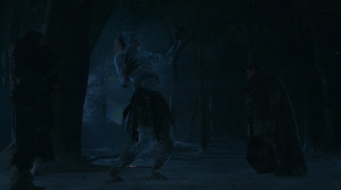 After the fight at the Fist, Sam is wandering in the blizzard looking for shelter. He suddenly notices another man of the Night's Watch. When he walks toward him, he discovers the man has been decapitated. A wight then approaches Sam, about to attack him. The direwolf Ghost knocks the wight down and rips out its flesh as it drags towards Sam. Finally, the wight is lit on fire by Lord Commander Jeor Mormont and the last remaining Night's Watch of the fight appeared. Mormont is angry that Sam didn't send any ravens in the confusion of the attack of the White Walkers. Finally, Mormont announces that they should retreat to the Wall and warn about the White Walkers to the others in Castle Black and the rest of Westeros.[17]