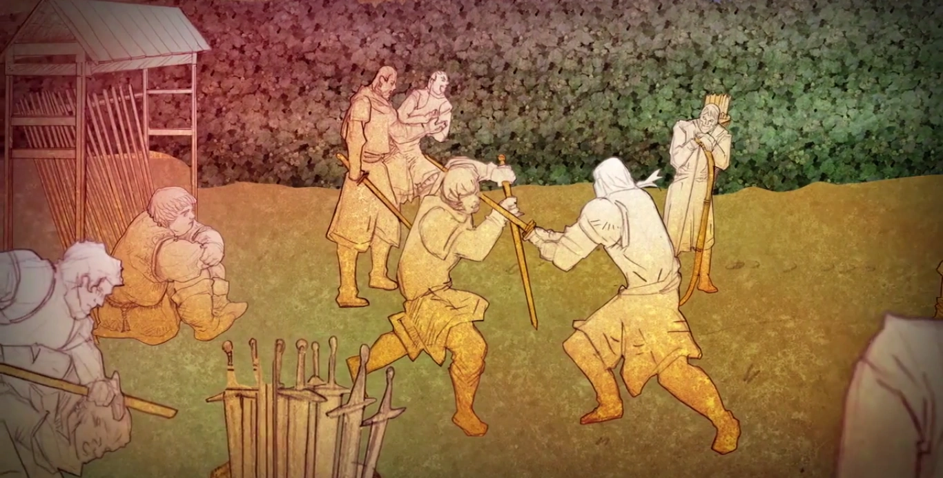Sam trains with Jon Snow, Grenn, and Pyp at Castle Black.