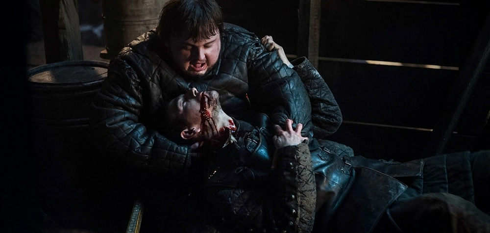 Sam brings Gilly and her baby to a storage room where she can hide. Gilly wants Sam to stay with her as he promised, but he cannot as he sworn to defend the Wall as a brother of the Night's Watch. Before he leaves her, Gilly begs Sam to promise her that he won't die and the two finally share a kiss. As Sam and Pypar are preparing arrows at the southern gate, Pypar laments that he never seen a real battle before or ever even held an edged blade. Pypar asks how Sam is not afraid, but Sam replies that he is, as there are thousands of wildlings about to overrun them. Pypar asks how he managed to kill a White Walker while being afraid, and Sam says that at that moment, he just had to do something or Gilly would have been killed and her baby would have been taken. Sam further explains that at that moment, he wasn't himself; he was nothing, and when you are nothing there is nothing to be afraid of. Before walking away, he looks at Pypar and says, "I'm not nothing anymore." When the battle for the Wall begins, Sam and Pyp take part in defending Castle Black's southern gate. Pyp is firing a crossbow as Sam assists by reloading another crossbow, but Pyp's aim is poor due to inexperience and nerves and he repeatedly misses his shots.[29]