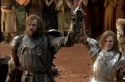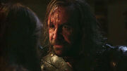 Sandor is amused when Gregor is unhorsed in a joust with Ser Loras Tyrell. Gregor attacks Loras and Sandor intervenes, saving Loras from a would-be-fatal blow. They exchange blows until King Robert orders a halt to the madness. Whilst Sandor bows to his king, Gregor begrudging storms off. Loras thanks Sandor "for his life, Ser", to which Sandor states that he is no "Ser." Loras then declares Sandor a champion and the smallfolk in the crowd cheer him, to Sandor's surprise and embarrassment.[5]
