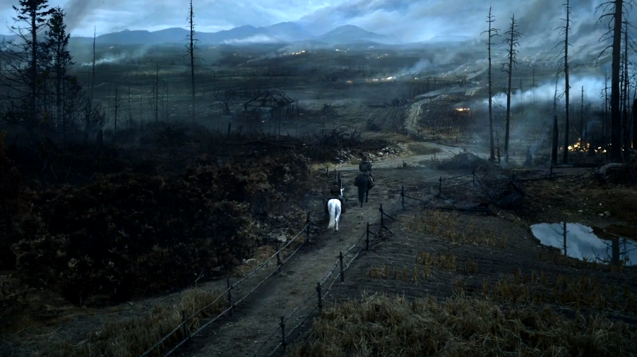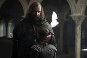 The Brotherhood Without Banners and Sandor are traveling through the Riverlands and remark upon the colder weather as they reach further North. They come across a seemingly abandoned farmhouse, which Sandor recognizes as the farmhouse he and Arya stayed at a few years earlier after being invited in by a farmer and his young daughter, Sally. As the group moves inside to see if anyone is staying at the farmhouse, Sandor and Beric discover the long dead bodies of both the farmer and Sally inside. Beric and he remark that they most likely committed suicide to avoid starvation.[33]