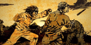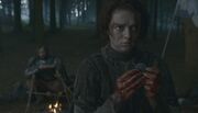 While riding, Sandor and Arya come across a group of Frey soldiers at a campfire. Arya dismounts from Sandor's horse, approaches them, and kills one of them. When the rest of the group are about to attack Arya, Sandor protects her and kills them. Sandor takes his knife back from Arya, then sits and eats what the deceased soldiers have left. He asks if this was Arya's first murder. She states it was her first "man."[22]