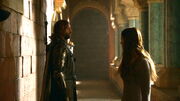 While talking to Jaqen H'ghar, Arya recalls the time when she robbed Sandor and left him to die after fighting Brienne of Tarth. Arya insists that she hates Sandor and wants him to suffer, but Jaqen can tell she is lying and hits her several times.[30]