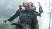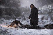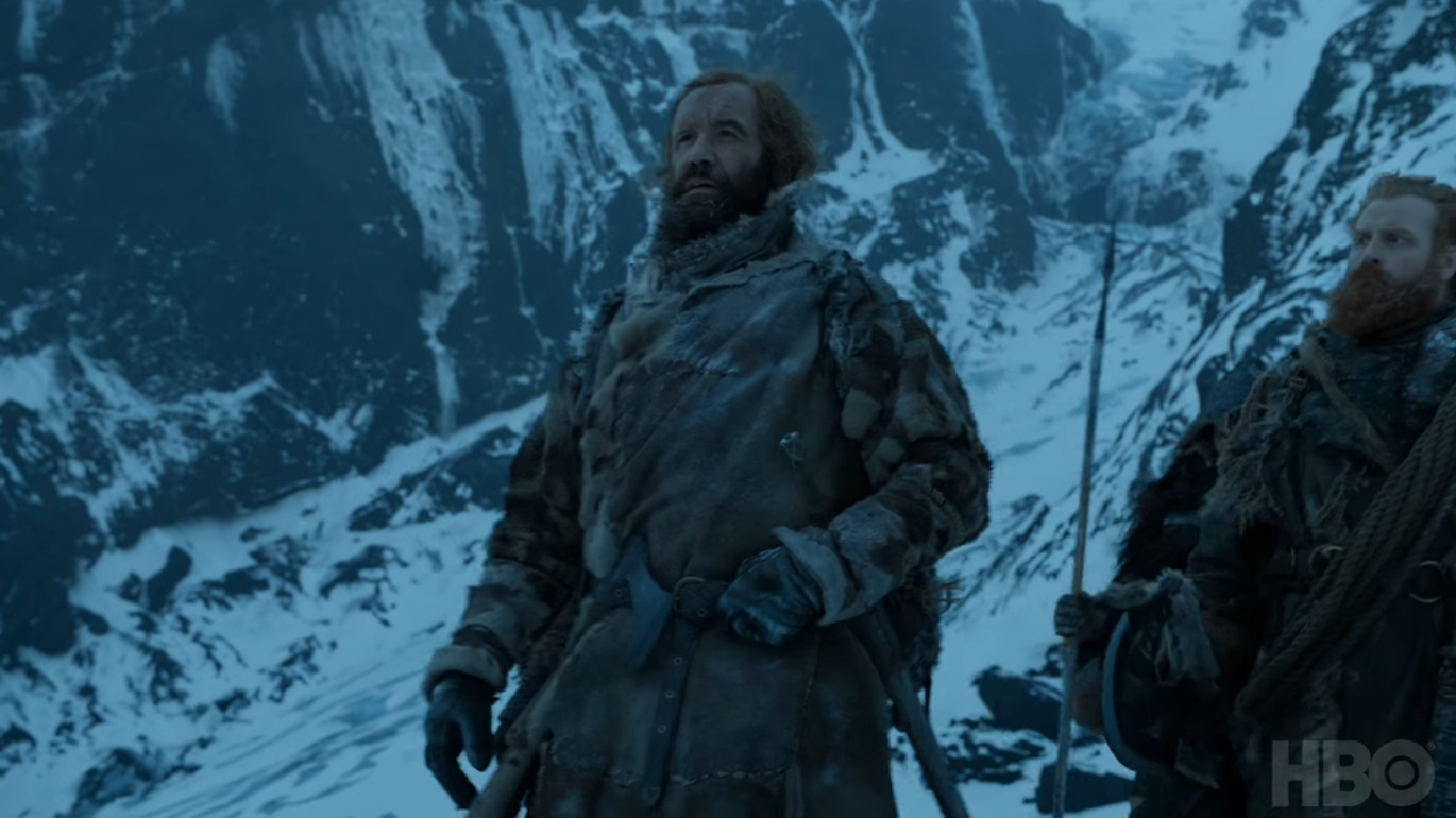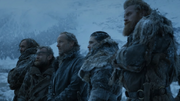 Jon recognizes Sandor from the latter's visit to Winterfell years ago, while Gendry openly distrusts the men of the Brotherhood. When Beric gives a speech claiming that the Lord of Light brought them together, a bored Sandor cuts him off and asks Jon if they are coming with them. Jon agrees and says they are all on the same side because they are still breathing. Sandor joins the rest of the Brotherhood, Jon, the wildlings (led by Tormund Giantsbane), Gendry, and Jorah Mormont in leaving Eastwatch and traveling north of the Wall.[34]