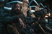 With Robb dead, Sandor now intends to ransom Arya, who is growing increasingly annoyed of her close proximity to him, to her aunt Lysa Arryn in the Vale. Eventually, they arrive at a tavern. Arya suggests attacking the men there, but as there are five men, Sandor is reluctant to do so. When Arya recognizes one of the men as Polliver, the Lannister man-at-arms who took her sword Needle, she tries to get it back. Sandor stops her at the tavern door, but they are noticed by the men inside. Wishing to avoid suspicion, the two calmly enter.