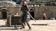 Using magic, Beric ignites his blade with fire, initially giving him an advantage during the fight due to Sandor's fear of fire. However, Sandor briefly manages to overcome his phobia and his superior strength eventually is enough to overpower Beric, and with a powerful downward swipe Sandor cuts deep into Beric's shoulder, nearly cutting off his entire arm and cutting right through Beric's flaming sword.[18]