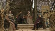 Sandor fights in King Joffrey Baratheon's nameday tournament, killing his opponent. Joffrey congratulates him on his skill, whilst berating Sansa, still his fiancee despite her father's "treason."[10] Joffrey has Sansa Stark stripped and publicly beaten by Meryn Trant following Robb Stark's victory at the Battle of Oxcross, whilst Sandor stands uncomfortably. Sandor gives her his white cloak to cover herself after Tyrion Lannister orders an end to the beating.[11]