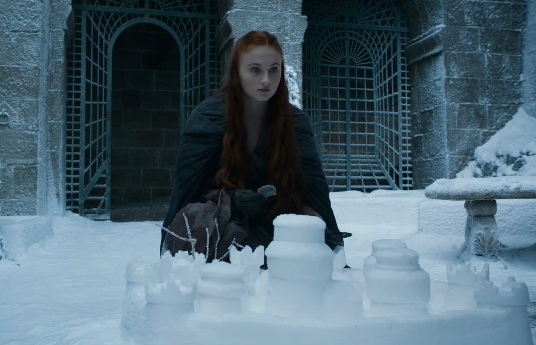 After settling into the Eyrie, albeit with discomfort, Sansa wanders into the courtyards alone, as the snow falls around the Vale. The snow, reminding her of home, prompts her to build a snow castle resembling Winterfell. She has a short-lived friendly conversation with Robin before she snaps at him for ruining her snow castle. This results in a heated confrontation between the cousins, which ends in Robin running back inside, crying after Sansa slaps him. Petyr presents himself shortly afterward, and Sansa questions him as to why he really had Joffrey killed. She allows herself to smile slightly when he claims that he did it for Catelyn, the only woman he ever loved. Sansa is shocked when he kisses her on the lips, which Lysa witnesses. She summons Sansa to the High Hall, where she sits over the open Moon Door. Sansa begins to grow concerned when Lysa comments on how far the drop is to the ground. Lysa, enraged over Petyr's interest in Sansa, threatens to have her killed and nearly manages to push her out of the Moon Door to her death before Petyr intervenes. Sansa watches as he tells Lysa that he only ever loved Catelyn, before pushing her to her death.[38]
