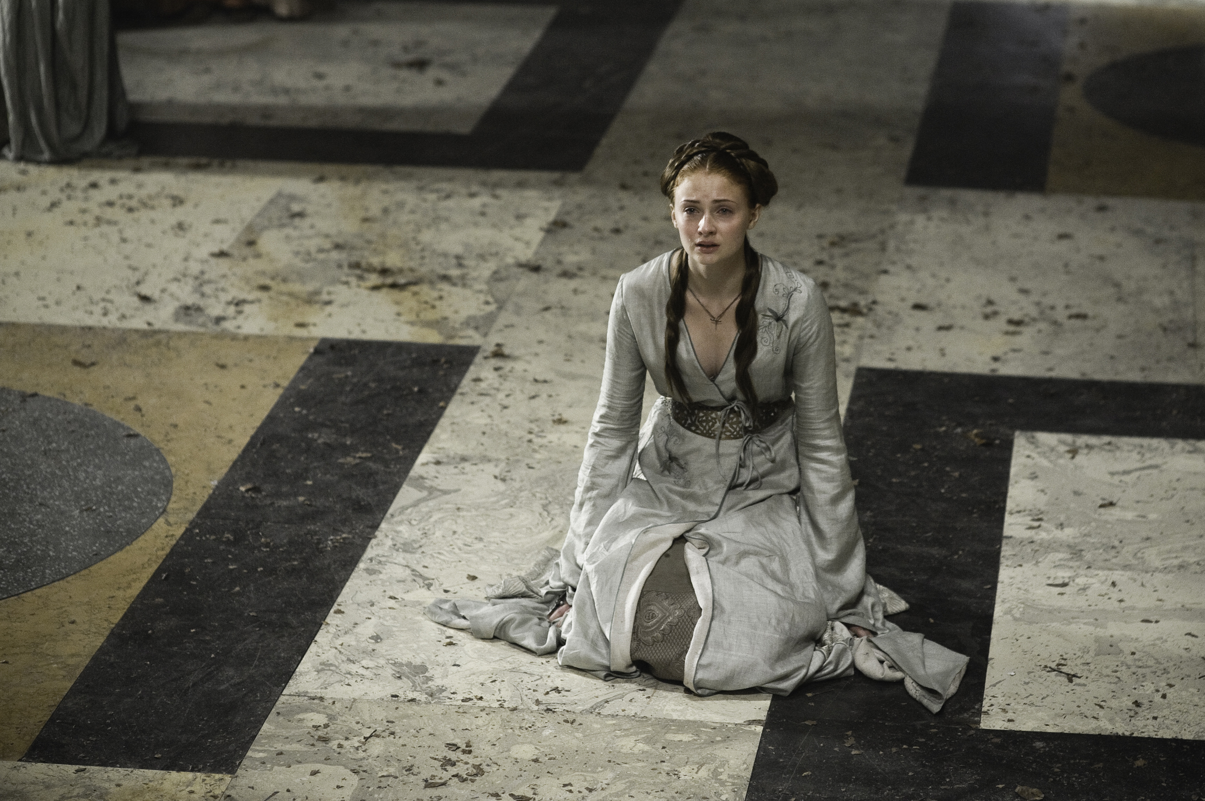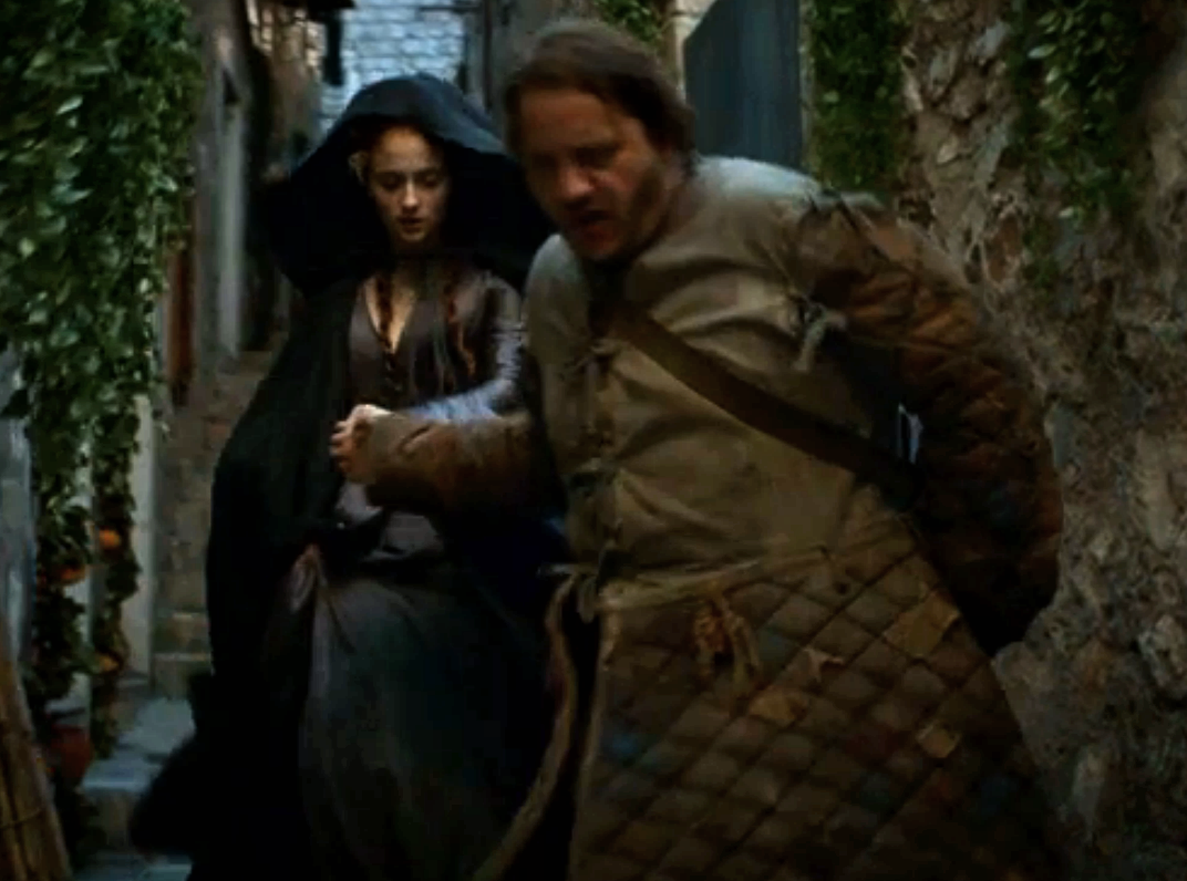 Sansa attends the departure of Princess Myrcella Baratheon for Dorne. She stands up to Joffrey when he mocks his brother Tommen for crying. As the royal party returns to the Red Keep, Joffrey is struck by excrement thrown by the angry crowd. Joffrey causes citywide riots by demanding that his guards kill all of the smallfolk present. In the chaos, Sansa is separated from the rest of the group and as she tries to flee to safety, she is pursued by a group of men who nearly rape her. She is rescued by the Hound, just as Tyrion is in the process of browbeating Joffrey for losing her in the first place. Shae treats her injuries and Sansa confides she thought the rioters were going to kill her, observing how they hated her and wonders why they would hate a stranger so much. Shae replies it is because Sansa has more than they will ever have, that her horse eats better than their children. Sansa says she would have given them food if she had it and she too hates Joffrey more than anyone. Shae warns her not to say such things and to trust no-one.[25]