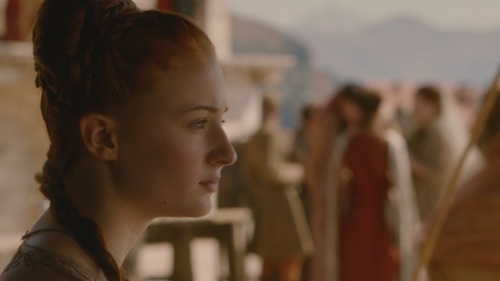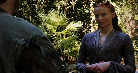While she prays at the Red Keeps's godswood under guard, Margaery comes and talks to her, telling her that they should see Highgarden, the Tyrell home, together. Sansa replies that Cersei would never allow her to leave King's Landing. Margaery tells her that she could be wife to her brother, and this idea pleases Sansa.[30]