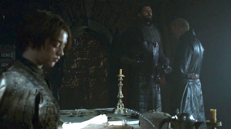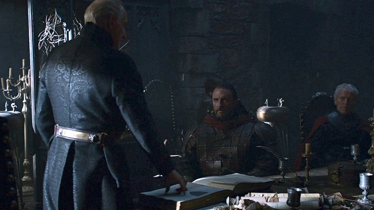 Tywin hosts a war council at Harrenhal.