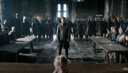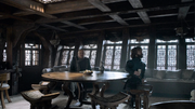 Tywin Lannister calls the first meeting of the small council since he arrived in the city and assumes his position as Hand of the King. He has the meeting place changed to a room next to his own quarters, asserting his dominance. Tywin arrives early and has all of the council members called in at once, with seats on only one side of the table, as a non-verbal test to see how each of them reacts around him. Petyr Baelish ambitiously pushes his way past everyone else to be the one who sits closest to Tywin. Varys rolls his eyes at Littlefinger's assertiveness and lets him pass, content to sit in the second-closest seat.[7]