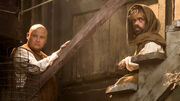 Varys provides Tyrion with a map of the tunnel network under the city. He warns Tyrion that their success depends on his leadership. He relays rumors of Stannis's conversion to the Lord of Light and tells Tyrion that he despises the dark arts practiced by Stannis's adviser Melisandre. The Battle of the Blackwater is won, thanks to Tyrion's ingenious defensive tactics and the timely arrival of a host of House Lannister and House Tyrell cavalry under the command of Tywin and Ser Loras Tyrell. Tyrion is betrayed and wounded by Ser Mandon Moore during the fighting.[18] Varys attends court as Joffrey rewards Tywin, Loras, and Littlefinger for their service. Varys visits the recuperating Tyrion and sadly informs him that his father is being given all of the credit for the victory and that he has relieved Tyrion as Hand of the King, that the members of the hill tribes have been paid and sent back to the Vale. and that Bronn has been removed from command of the City Watch.[19]