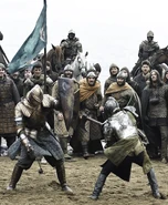 - Despite the fact that King Renly's camp is supposed to feature light-hearted "knights of summer" acting like war is a game and holding a tournament, it is very dark and overcast during this scene. Due to production delays, filming of this scene had to be pushed back to September 2011, even though it was originally intended to be filmed about a month earlier when it was sunnier. Just then, the remnants of Hurricane Irene swept in across the Atlantic Ocean and battered Ireland, though by that point it had degenerated into a front of severe storms. Even when it was not raining, the sky was filled with storm clouds and cold winds blasted through the location. As they were already behind schedule, it was not possible to postpone filming the scene any further, so they were forced to film the "knights of summer" scene in cold and stormy weather. This was something of a problem for the cast, who were still wearing the summer clothing that their characters should have been wearing in Renly's camp. Many cast members were at least wearing their armor, but Natalie Dormer (Margaery Tyrell) was wearing a light summer gown with a plunging neckline, and as a result was freezing during the filming of this sequence. Between takes, the costume department would rush to cover Dormer in blankets and give her hot water bottles. Dormer recounted, "that tournament scene was just unfortunate."[8]